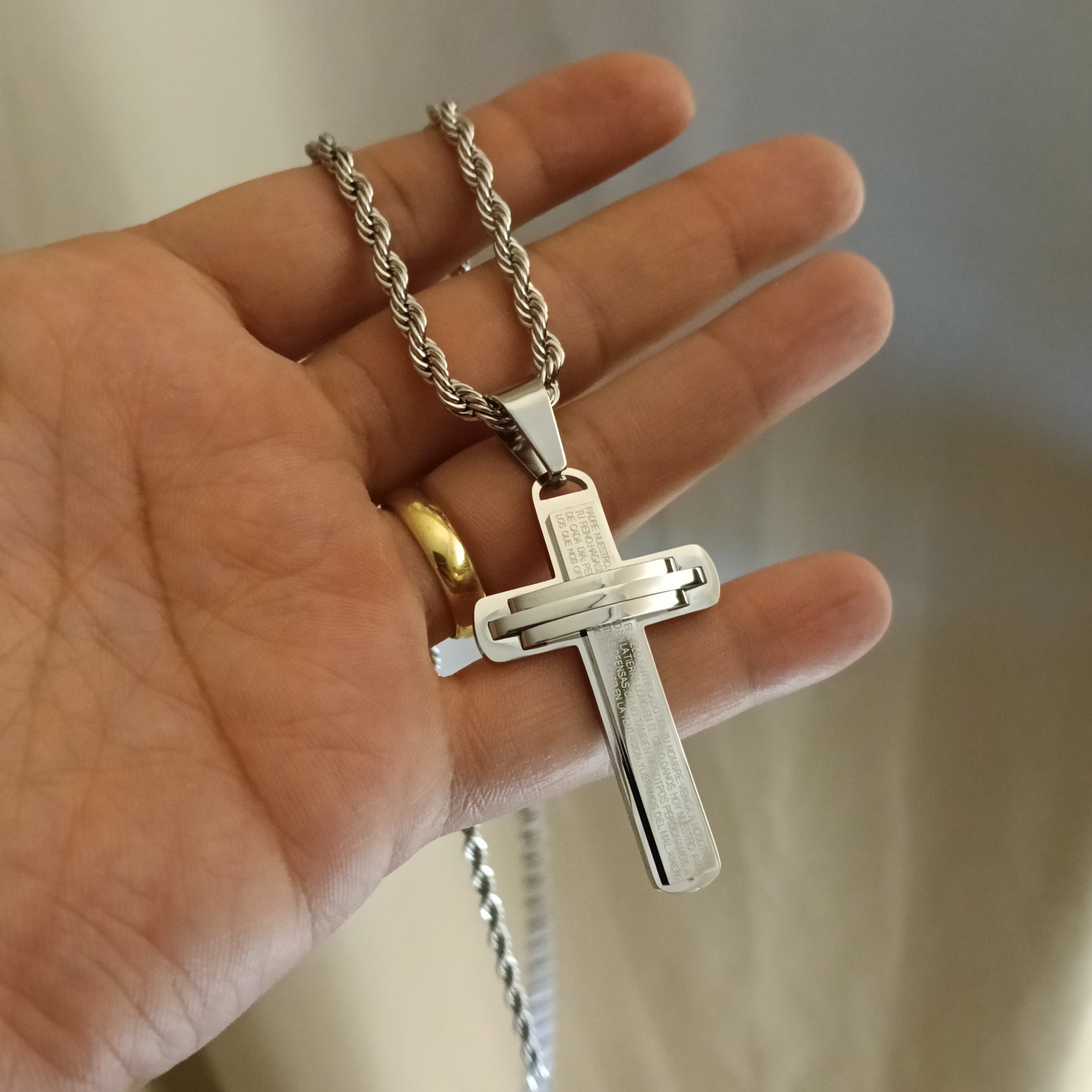 مع صليب الصلاة الربانية باللغة الاسبانية